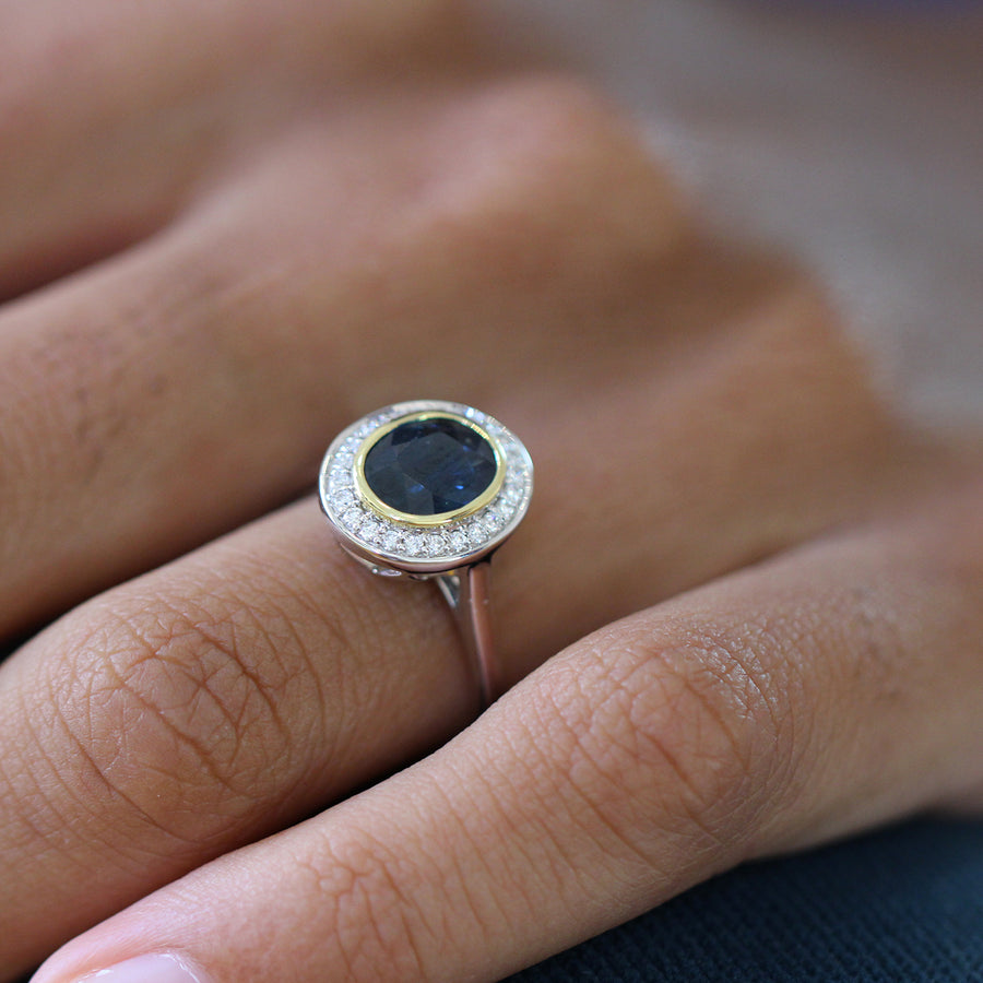 A large coloured centre stone surrounded by diamonds in a halo effect.