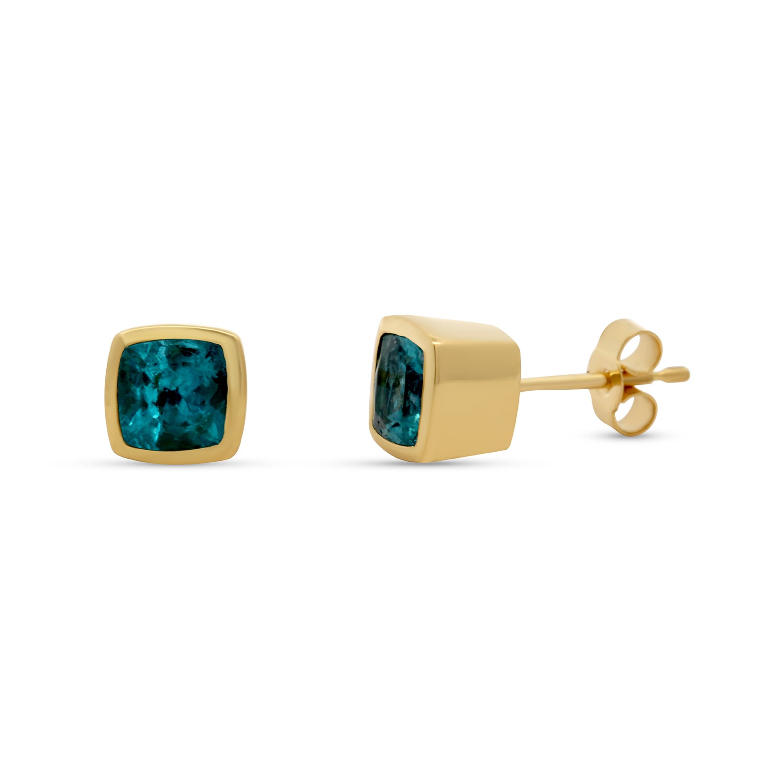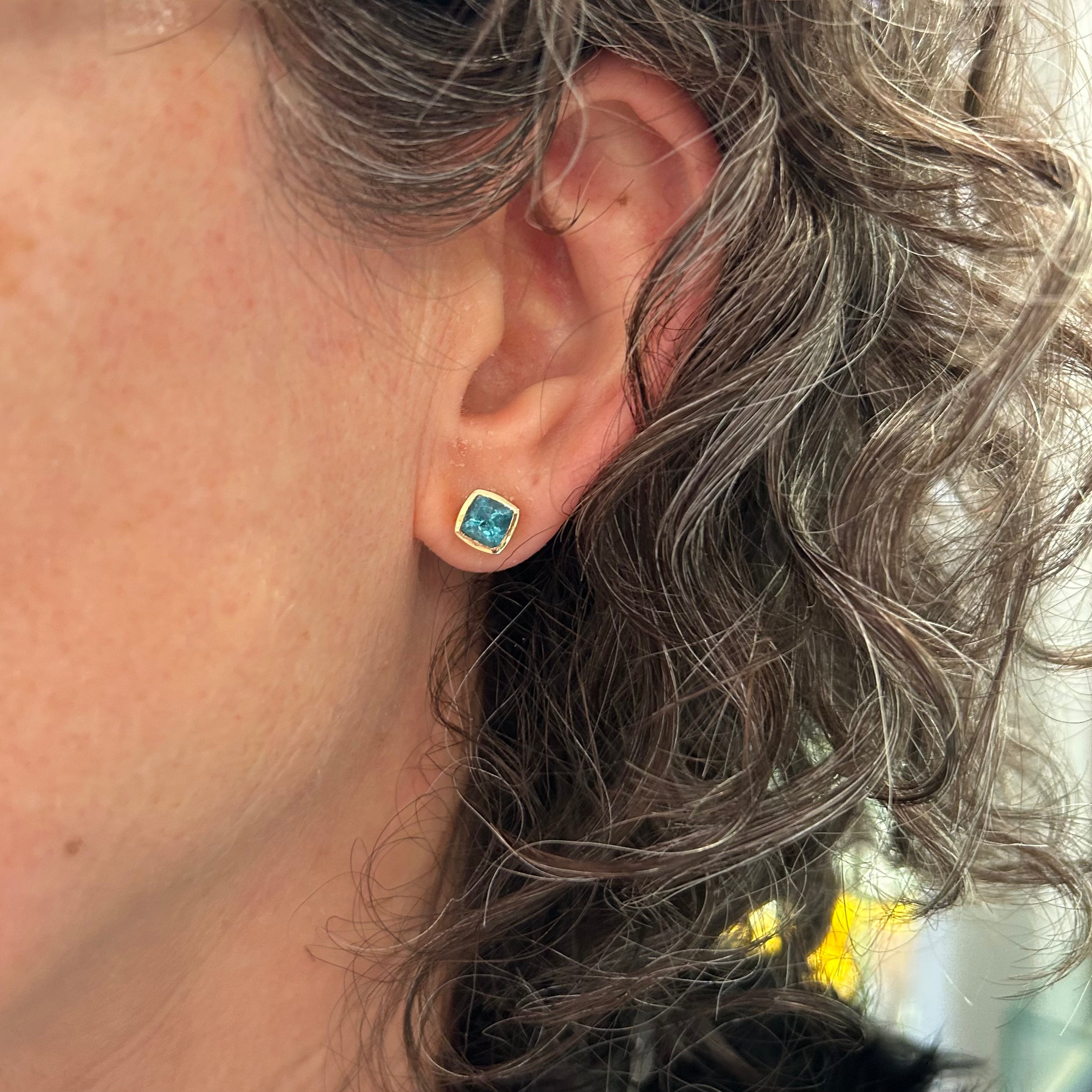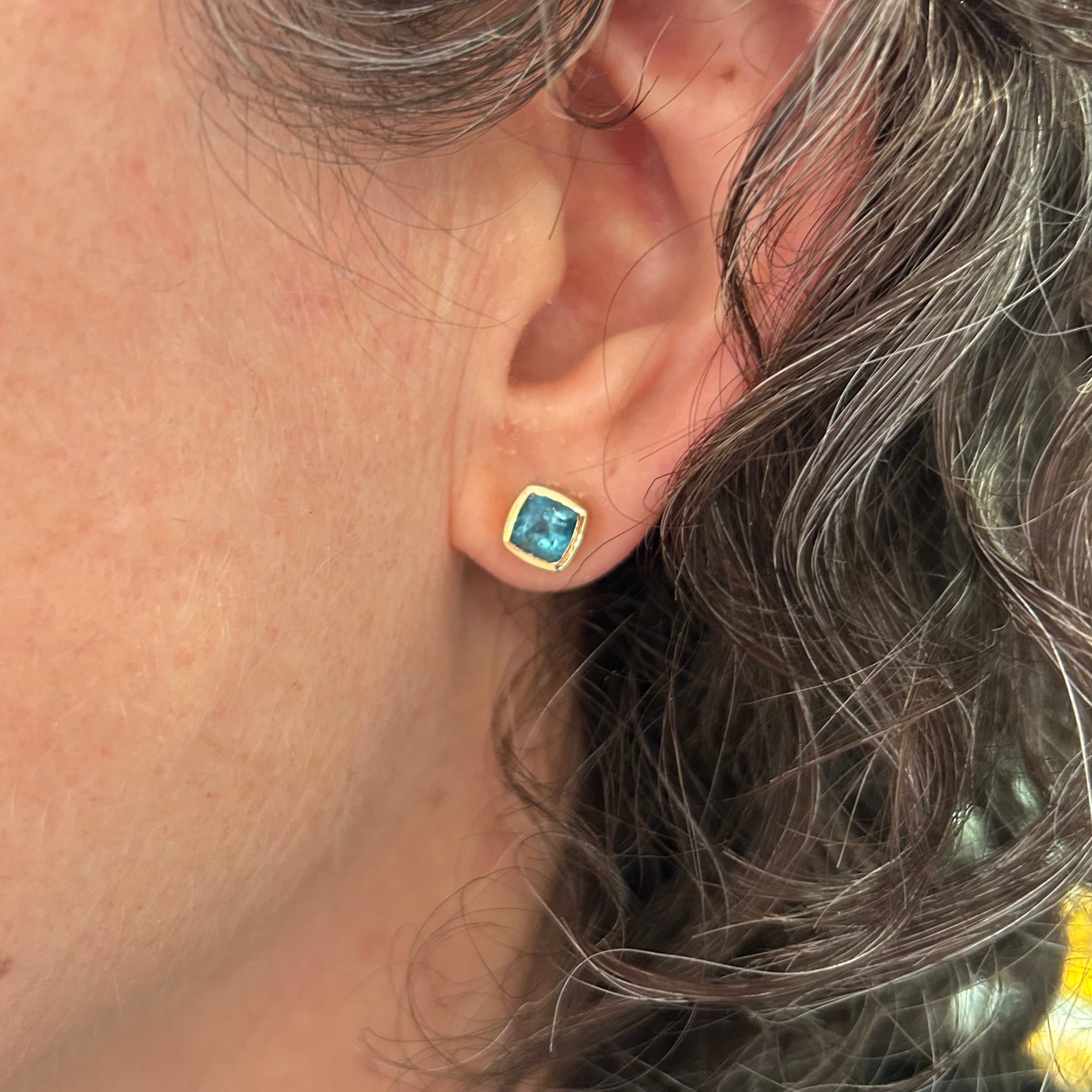 A pretty pop of electric blue, securely wrapped in solid 18 karat Fair Trade Certified Gold. The Bezəl design is easy to wear and these stunning cushion apatite gems add a luxurious pop of colour to your everyday wardrobe, be it business or casual. Apatite is known as the gemstone of inspiration, motivation and creativity and would make a thoughtful gift for someone ready for a change or starting on a new path.