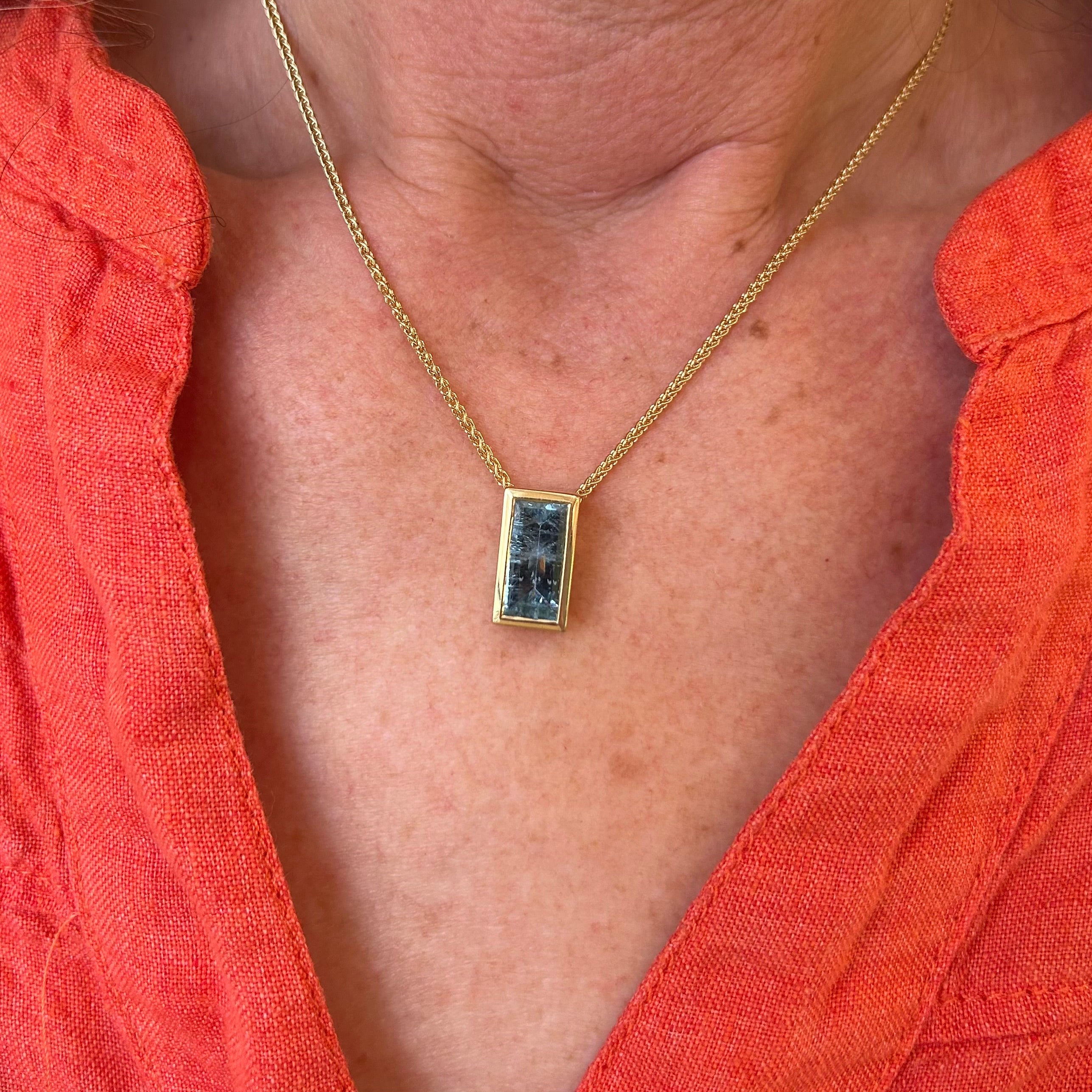 A gorgeous mirror cut aquamarine 3.29ct, securely wrapped in solid 18 karat Fair Trade Certified Gold. The Bezəl design is easy to wear and this stunning aqua adds a luxurious pop of colour to your everyday wardrobe, be it business or casual. All hanging from a heavy spiga link chain with a fitting at both 16 inches and at 18 inches for maximum versatility.