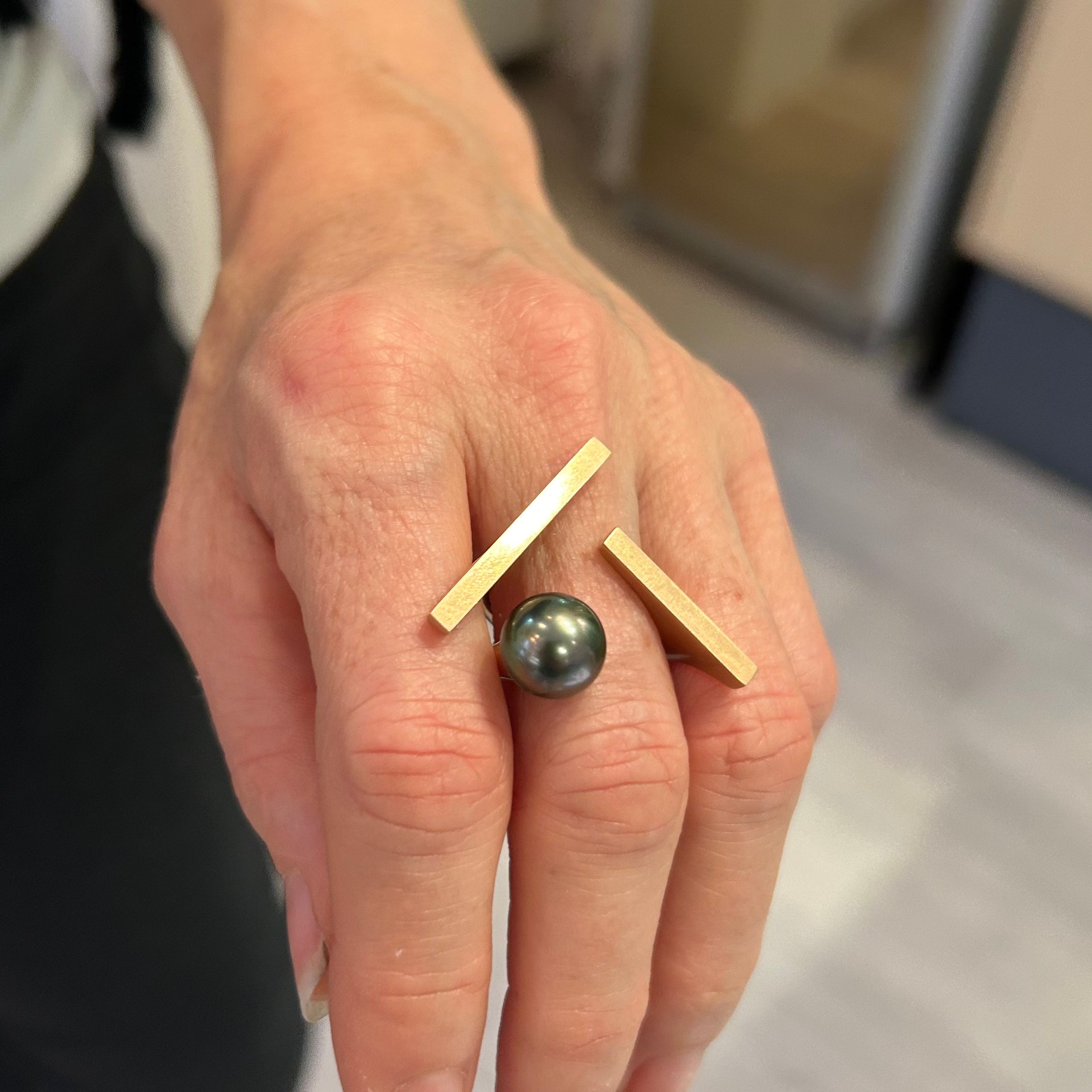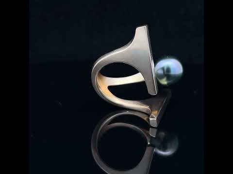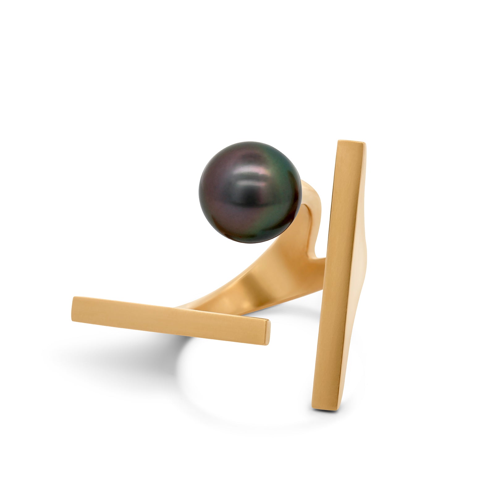Effective use of simple geometric shapes in 18k gold and Tahitian pearl result in this striking contemporary open-ended ring.