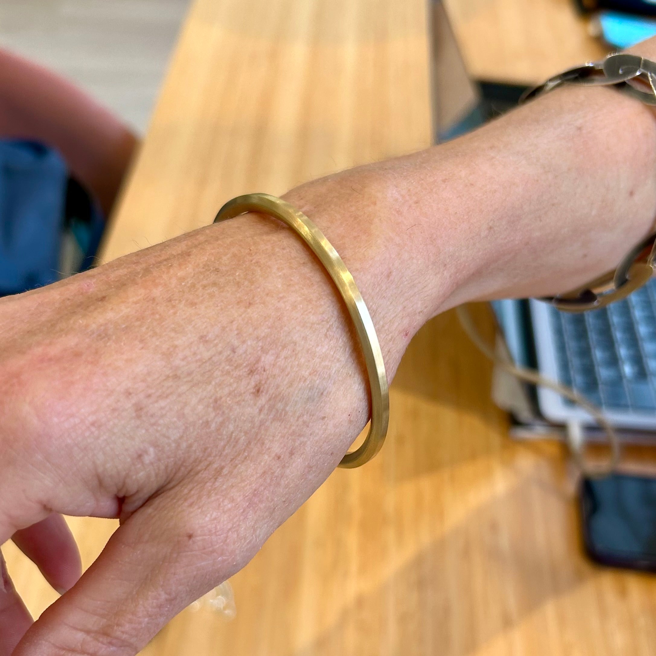 A DesignYard staple, created using recycled gold in the DesignYard workshop. This solid 4mm wide hexagonal profile bangle is a must-have. Available to order in different wrist sizes.