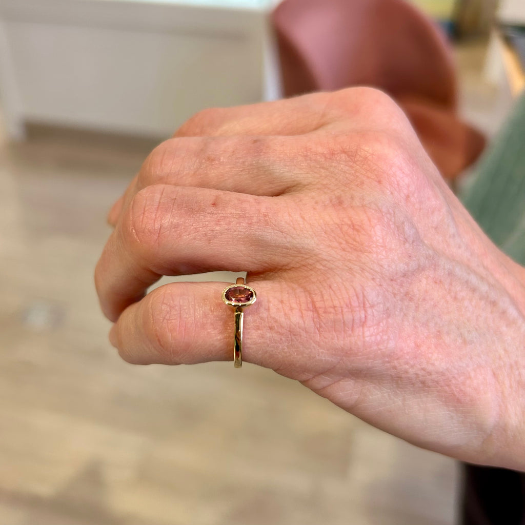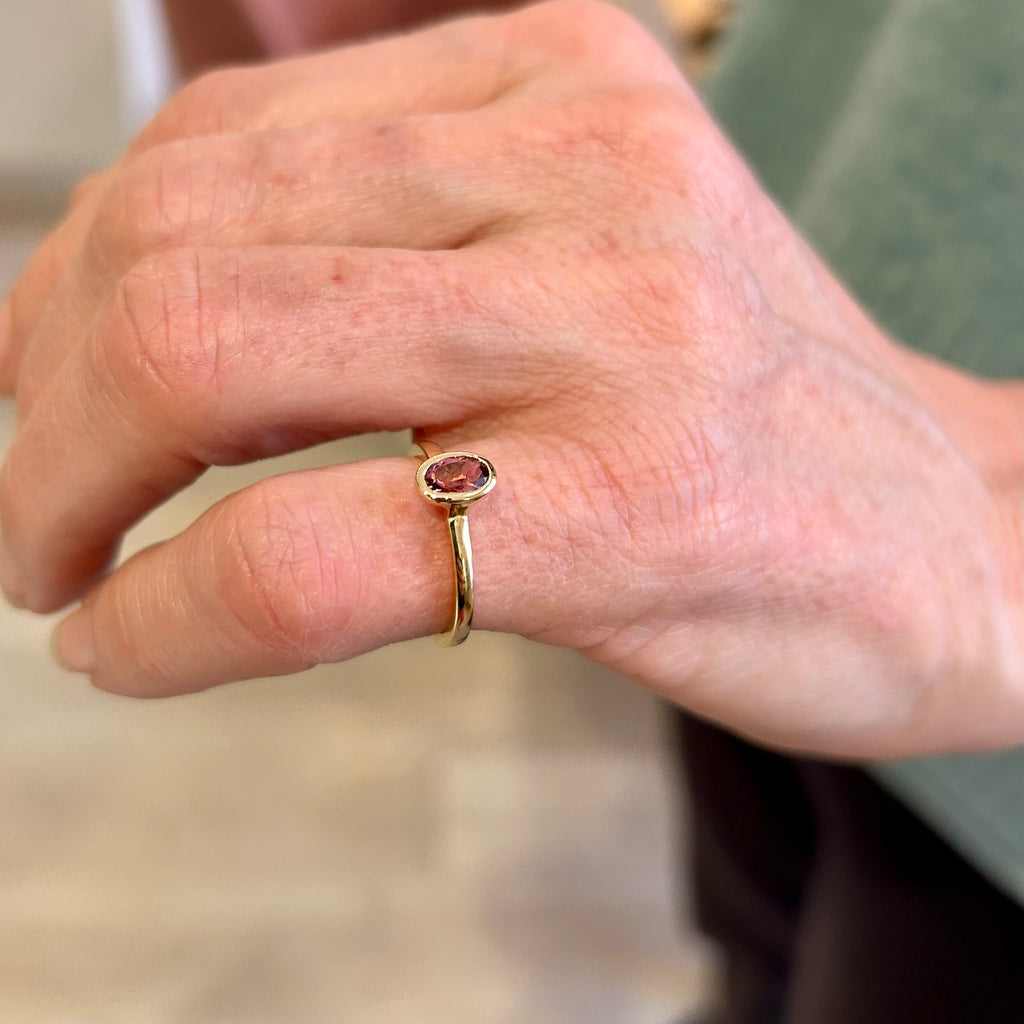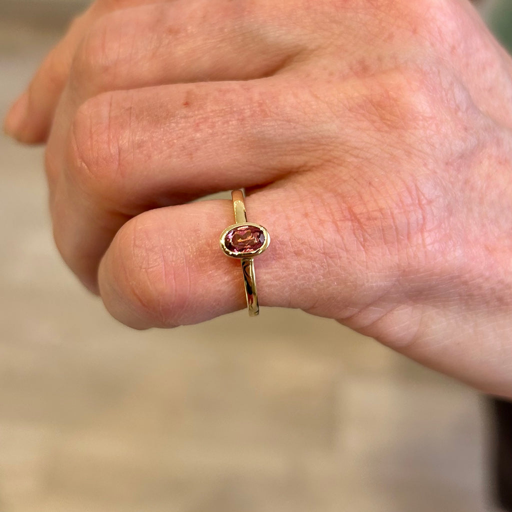 With its sleek lines and minimalist design, the Mēdēəm Bezəl ring lets the fabulous oval pink tourmaline do all the talking. The alluring oval is securely nestled in a luxurious bezel setting. Its open-worked supports allow maximum light into the gem for the best sparkle, while the elevated setting comfortably accommodates a ring (or two) to create your perfect wedding stack. A strong design by Ronan Campbell, hand made using 18 karat fair trade certified yellow gold.