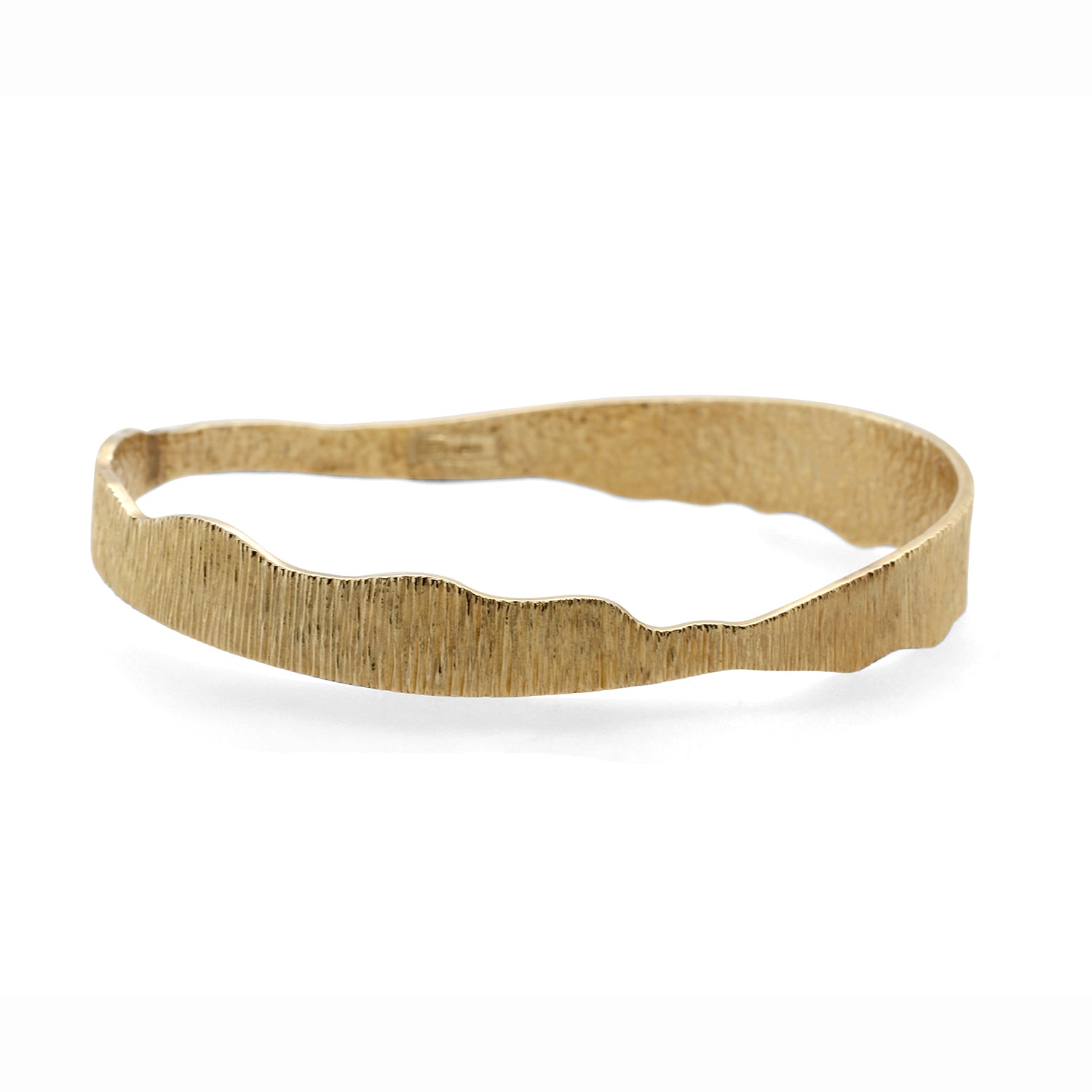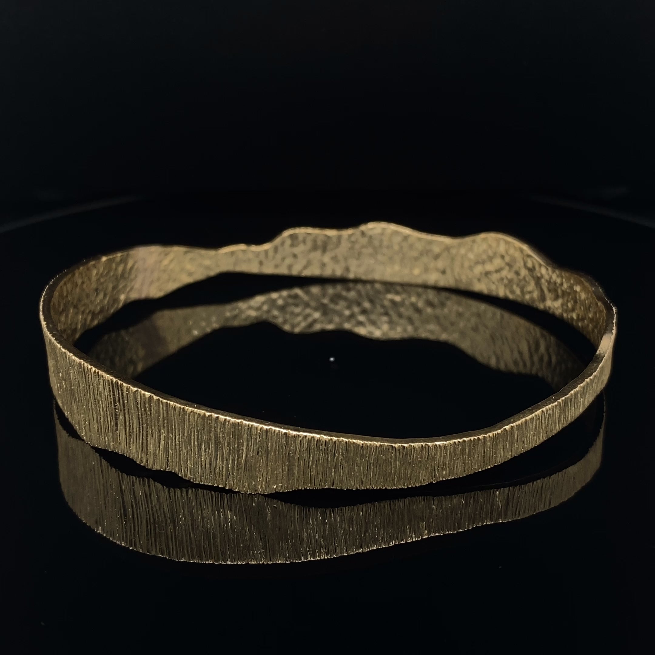 Strong form and texture come to the fore in this elegant undulating oval contemporary bangle in 9k yellow gold.
