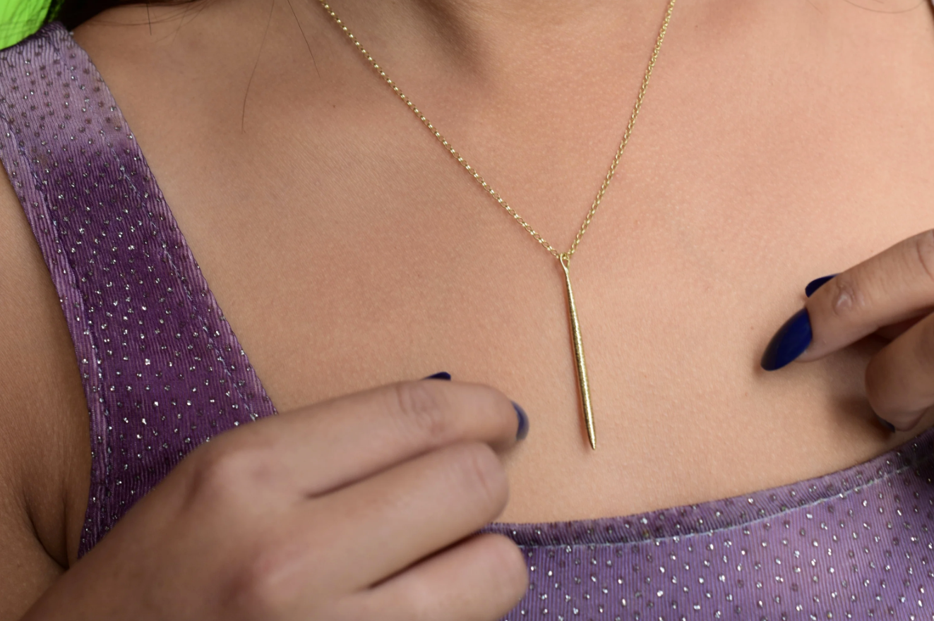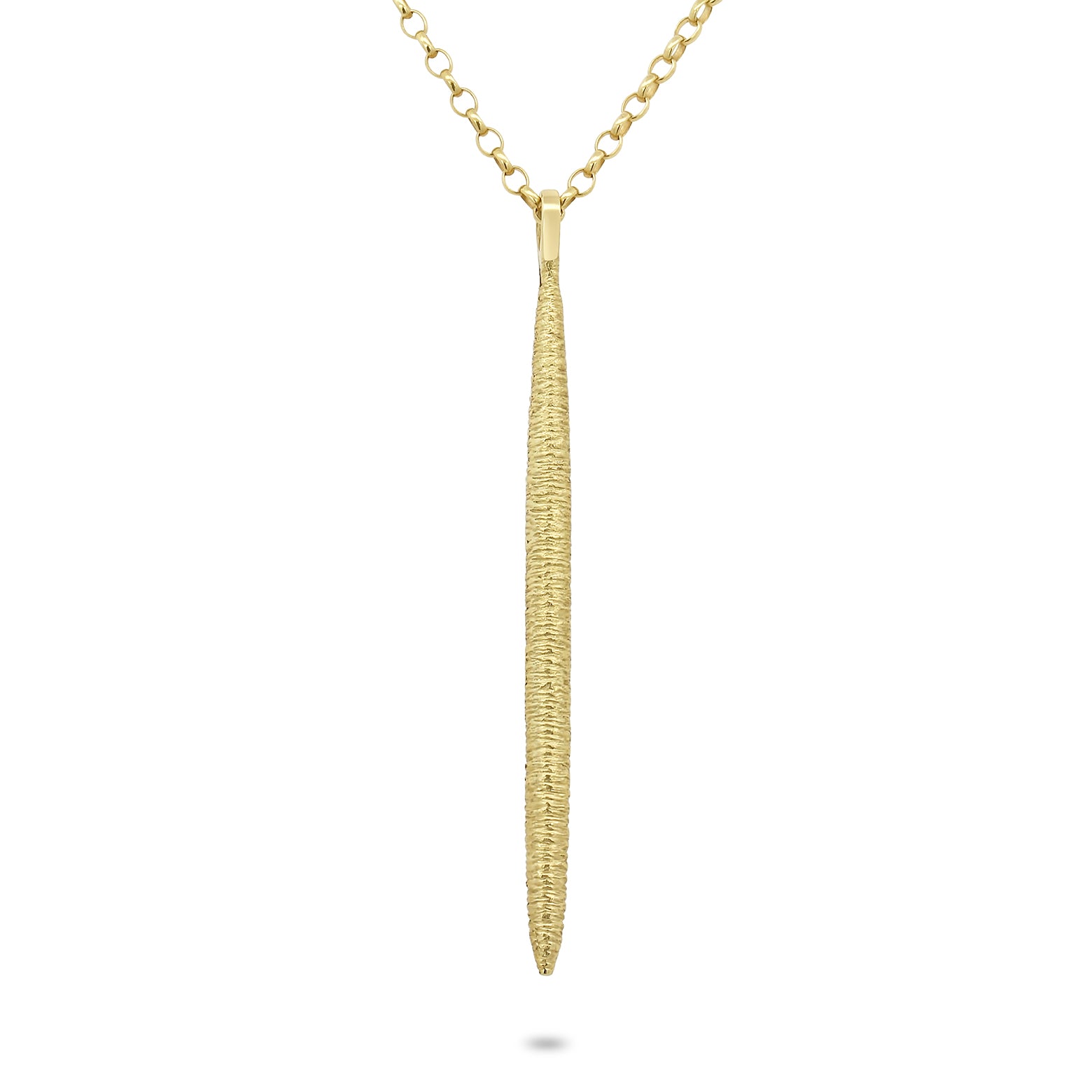 This long pendant features sculpted, spindle-like forms that echo the torc-inspired lines central to the Síoda Collection. Its textured surface catches the light beautifully, offering a subtle, sophisticated gleam that highlights both craftsmanship and design.
