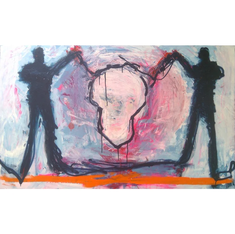 Two silhouettes lift a suspended heart between them, the red mass trembling like both sacrifice and gift. Blood-rich tones meet soft greys in a balance of tenderness and danger. An Offering examines connection as exchange, the cost of giving, the fear of release.