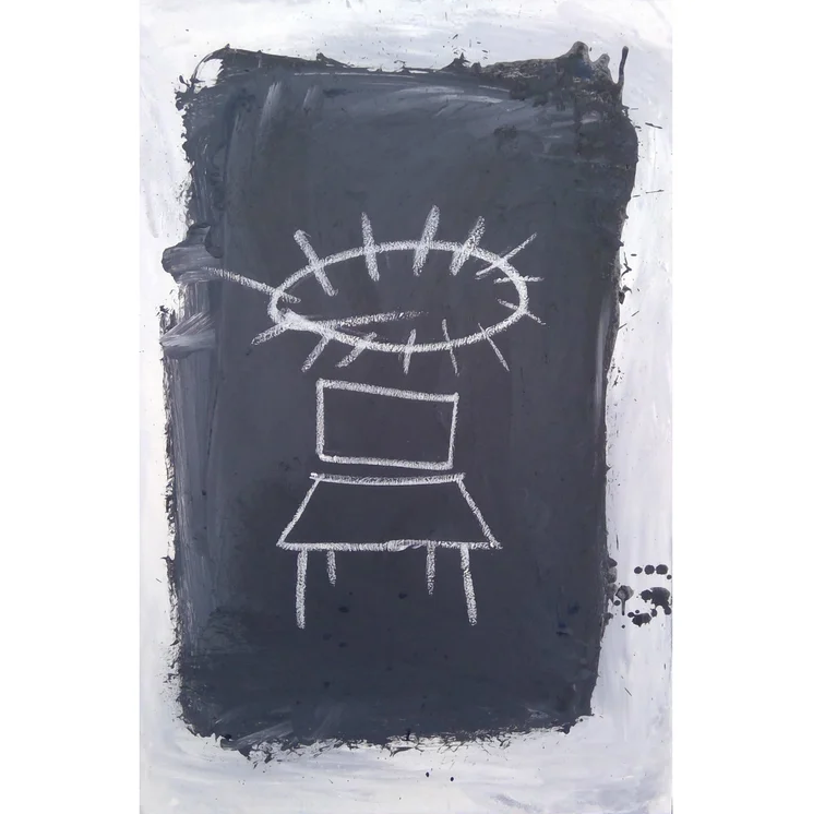 A chalk-white chair floats in a field of dark grey, absence drawn as presence. Empty Chair turns loss into symbol, a seat once filled now resonant with memory. Its quiet simplicity becomes a pause in the exhibition’s rhythm a moment to sit inside silence.