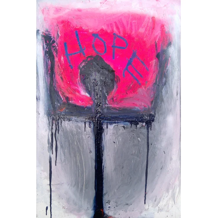 A lone figure rises beneath a surge of hot pink and blue-black shadow, part prayer, part protest. Bright magenta glows with fragile optimism while darker tones anchor it in struggle. Hope #01 embodies endurance rather than redemption, belief that flickers yet refuses extinction. Hope becomes defiance, a light surviving the gravity of remorse.