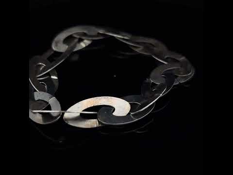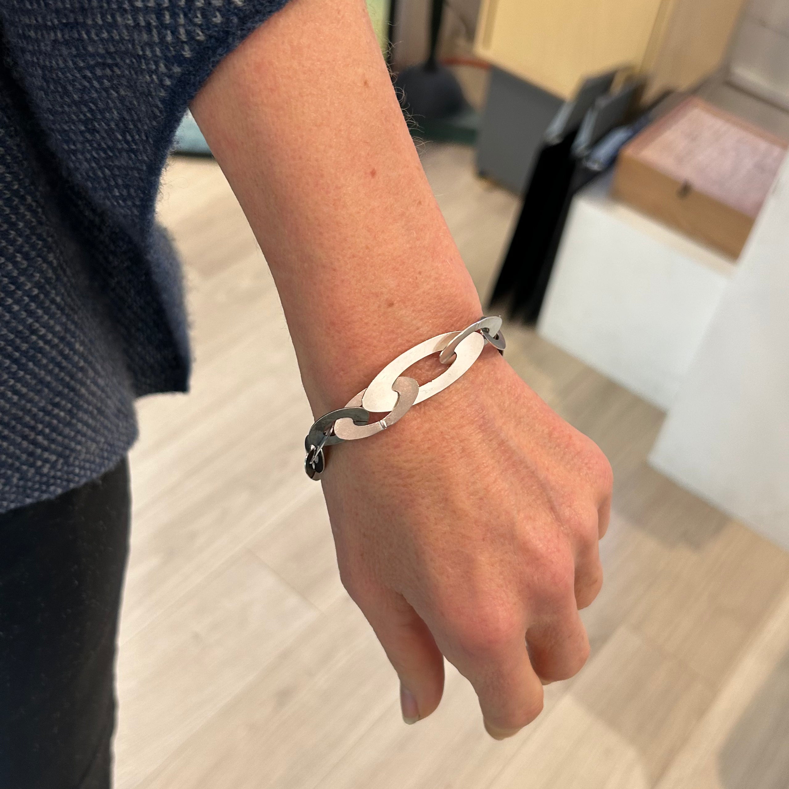 Inspired by the raw beauty of industrial chains in working ports, this handmade statement bracelet is a perfect balance of strength and sophistication. Each broad oxidized silver link reveals subtle traces of the fusing process, adding an organic softness to its bold, graphic design. The three larger bright silver links catch the light beautifully, creating a striking focal point contrasting against the dark silver.