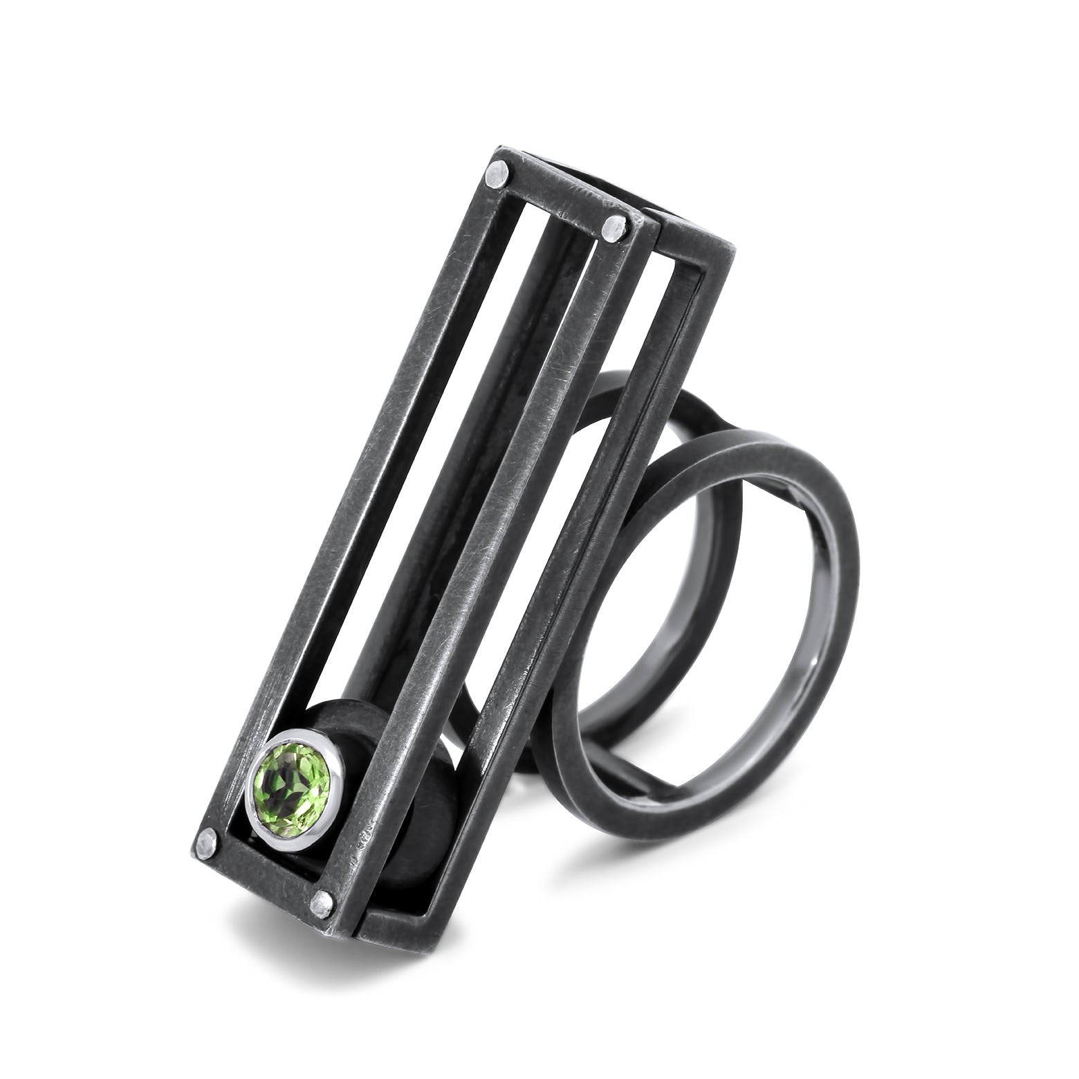 The fresh green hue of peridot contrasts beautifully against the deep, steely grey of oxidized silver, while a mix of matte and high-polish finishes enhances its architectural appeal. Three-dimensional and boldly unisex, this ring is designed to move with you—effortlessly modern, endlessly captivating.