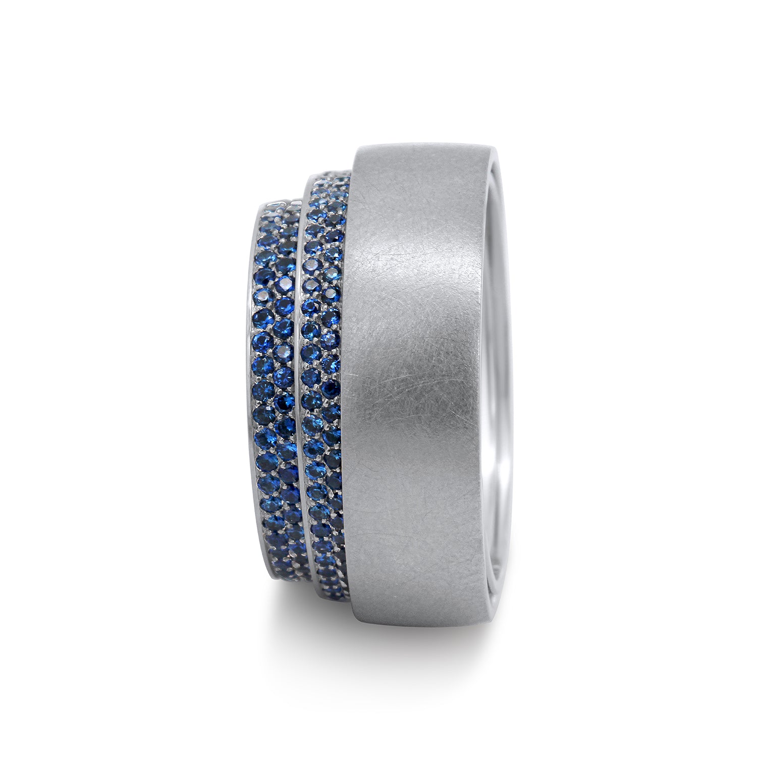 This playful hide-and-reveal ring is made of three individually moving rings. Continuously in motion, the brushed platinum is contrasted with rows of sparkling diamonds and vibrant blue sapphire. Each Tenda is unique: this one has 212 round brilliant diamonds (F Colour VS1 clarity 1.285ct) along with 212 vibrant blue sapphire (1.385ct) Contemporary high jewellery at its best. Can be made to order in various metals, see for example our platinum Tenda.