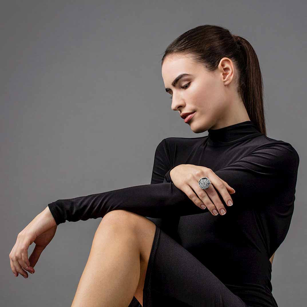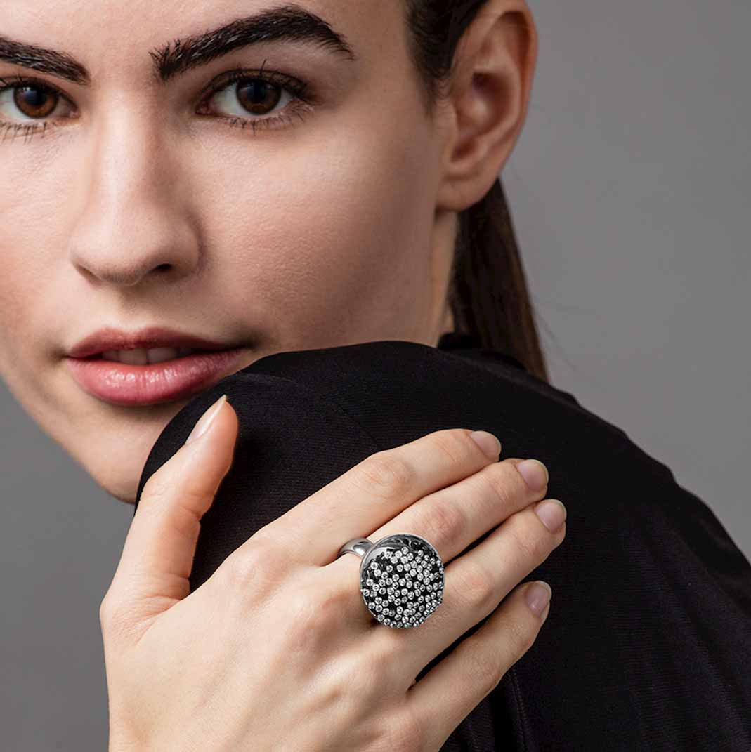 Swing has been inspired by the poetic motion of a cornfield undulating in the wind. Crafted from 950 platinum and enhanced with 85 flexibly mounted brilliants, Swing comes coruscatingly alive with its wearer's every movement. Swing has won the German Design Award Special 2018.