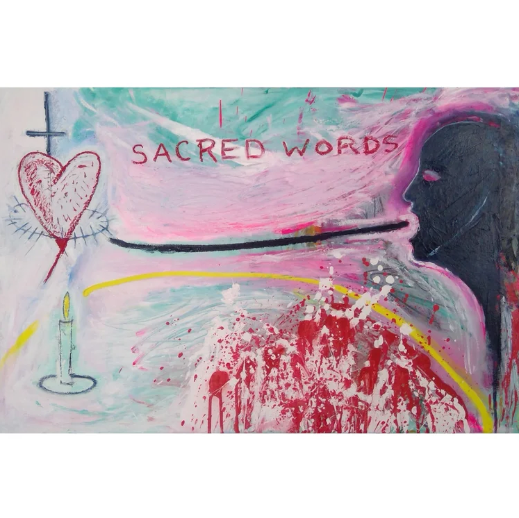 Muted reds, greys, and pale yellows move between confession and confusion, showing how language meant to heal can also wound. Words dissolve into the surface, their sanctity eroded by repetition. Sacred Words captures the ache of communication, every apology both prayer and fracture. The work opens the exhibition’s emotional arc: language as devotion, guilt, and the search for peace after speech.