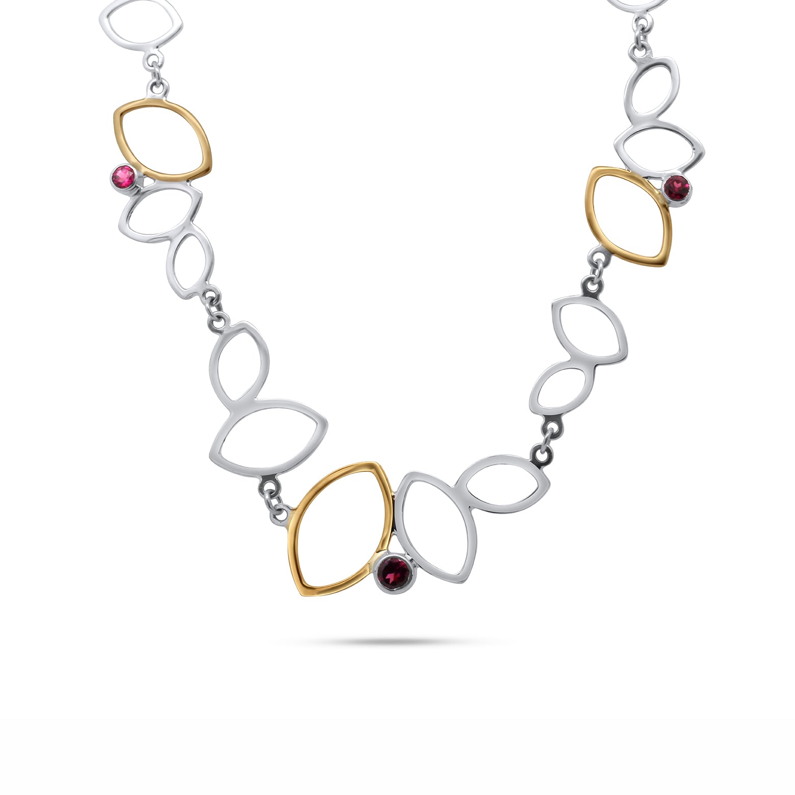 This versatile two-tone necklace features playfully arranged leaf shapes, accented with gorgeous sections of solid 14k yellow gold and beautiful rhodolite garnets. The unique design and intricate detailing bring an elegant feminine flair to the contemporary necklace - stunning piece that is perfect for any occasion.