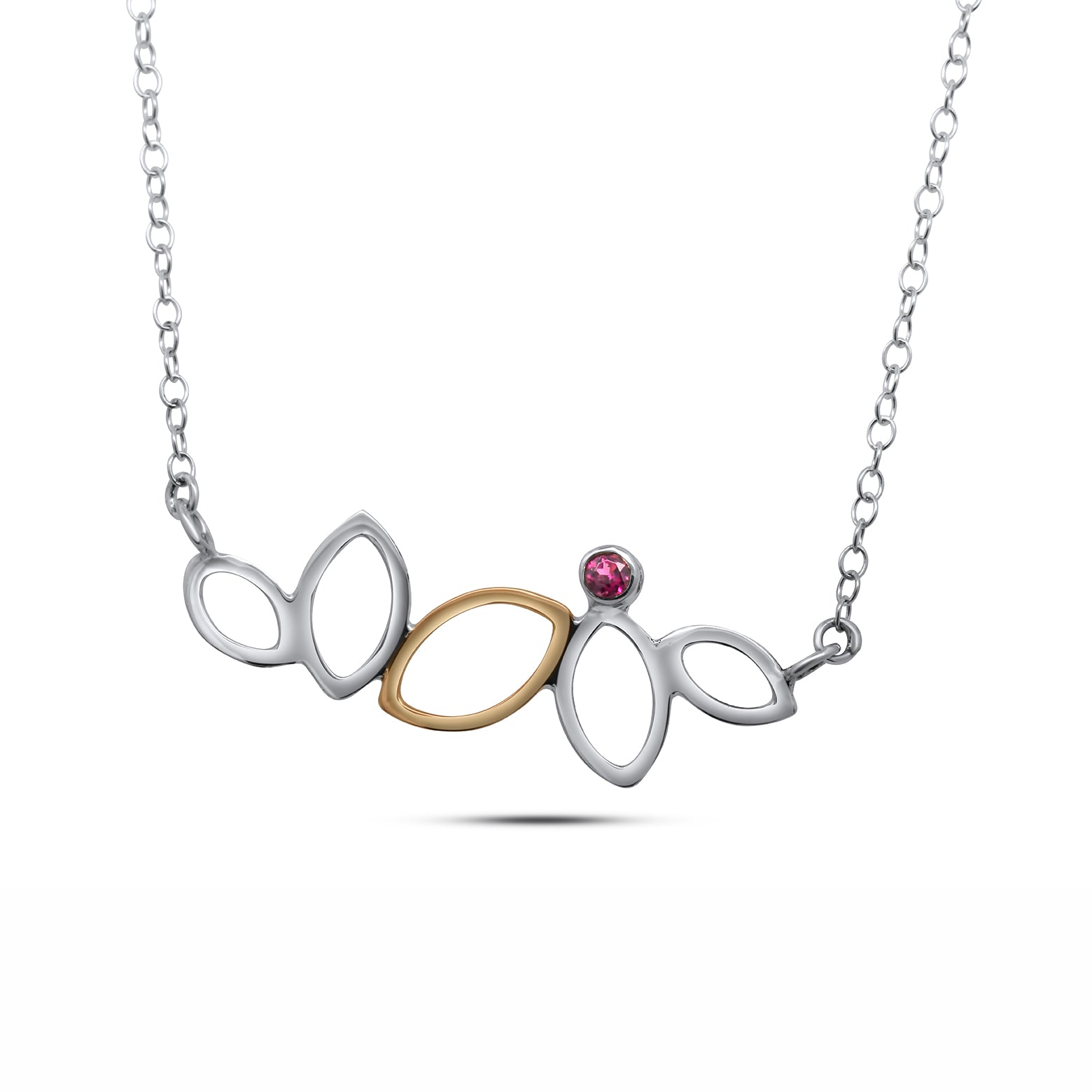 This versatile two-tone pendant features playfully arranged leaf shapes, accented with gorgeous sections of solid 14k yellow gold with a beautiful rhodolite garnet. The unique design and intricate detailing bring an elegant feminine flair to the contemporary pendant - stunning piece that is perfect for any occasion.