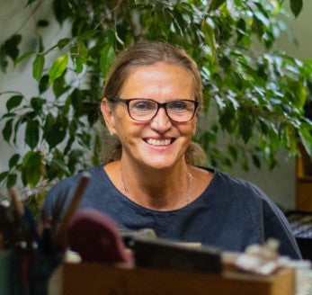 Working directly without drawings from her London studio, she has her own distinctive technique combining silver and applied 24 carat gold with influences including modernist abstract forms, Art Deco, Medieval antiquities and the Vienna Secession.